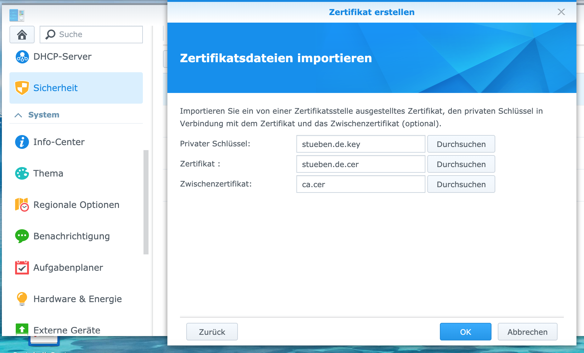 Nun öffnest Du auf der Synology NAS die Systemsteuerung, wählst den Punkt Sicherheit aus und oben in der Menüleiste Zertifikate und importierst die eben erstellten Zertifikate aus dem Verzeichnis.